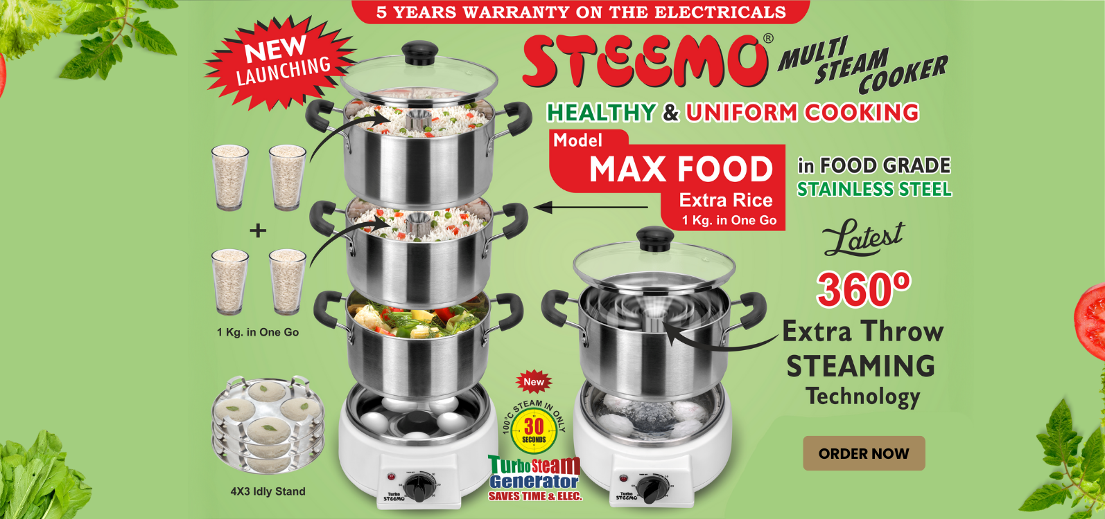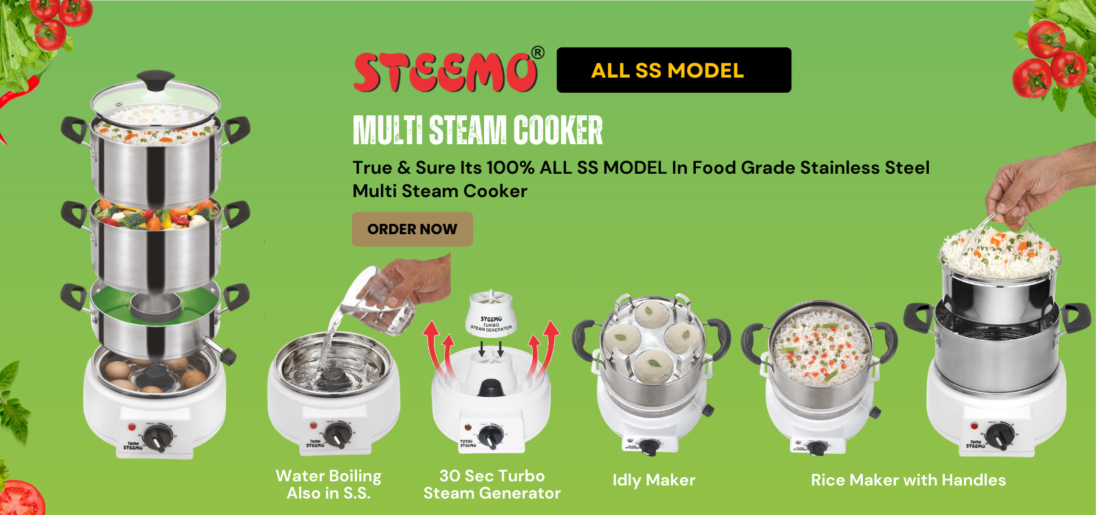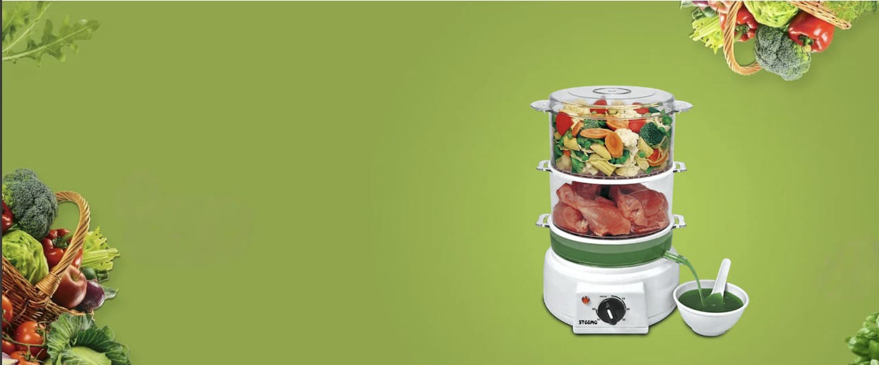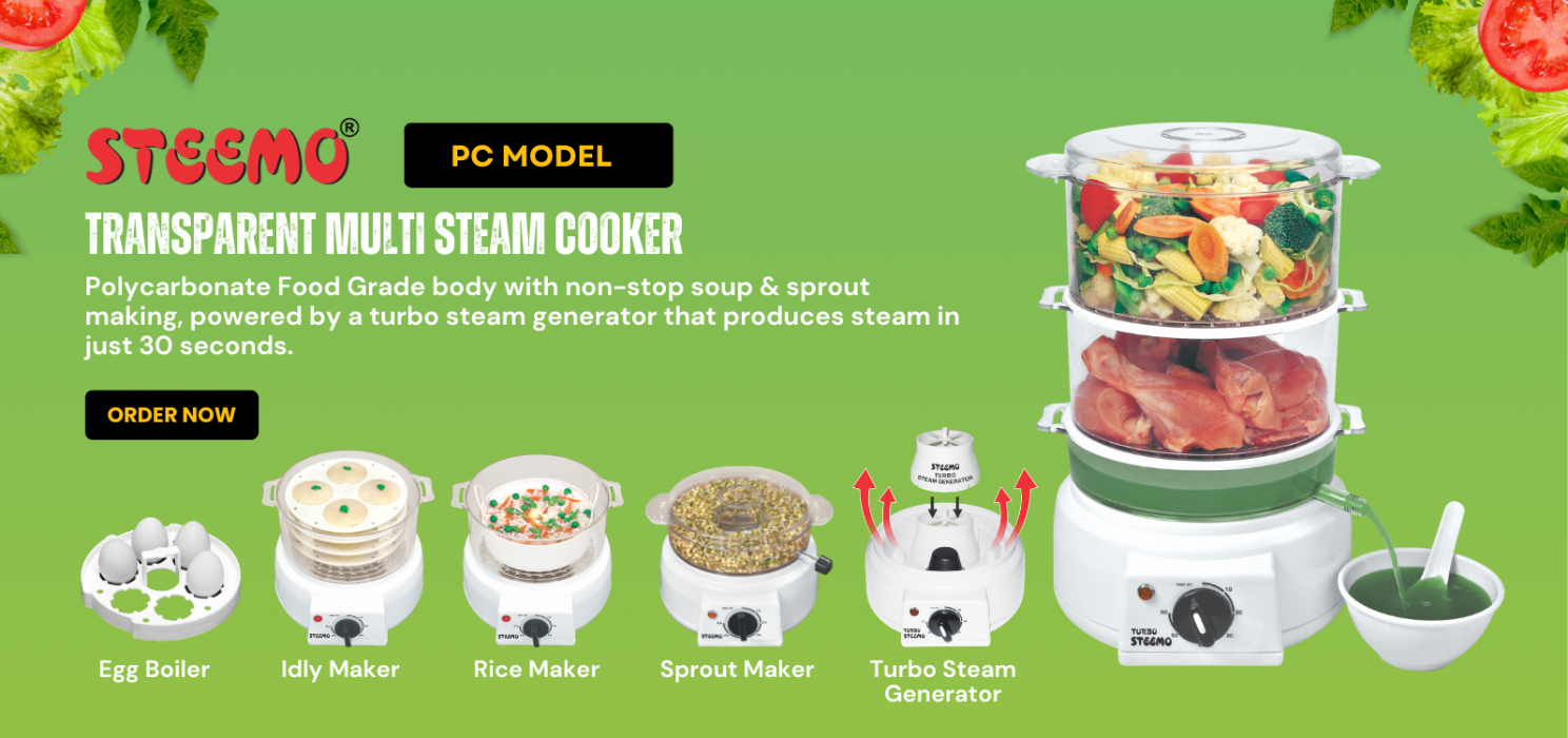 Presenting World's Best Steemo Steam Cooker Both In Stainless Steel & Poly Carbonate Transparent Models saprator for all the headings